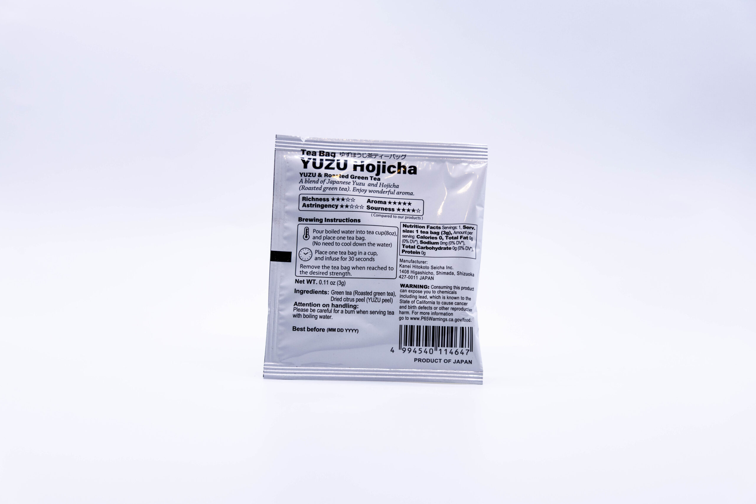 Blended Japanese Hojicha (Roasted green tea) and dried Japanese Yuzu peel and made into a 3g tea bag.