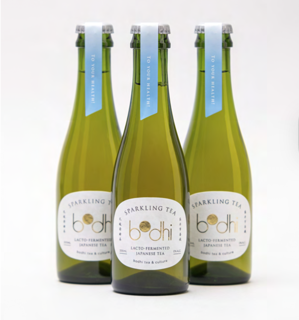Bodhi is a non-alcoholic sparkling tea made from Bodai Sancha, a rare lacto-fermented tea grown in Shizuoka, Japan. The tea leaves are harvested in autumn and naturally fermented for four weeks using lactic acid bacteria found in the leaves—similar to those in yogurt or fermented foods. This patented process gives the tea a mild, wine-like acidity while keeping its natural tea character. Solar drying further refines its clean, eco-friendly profile.